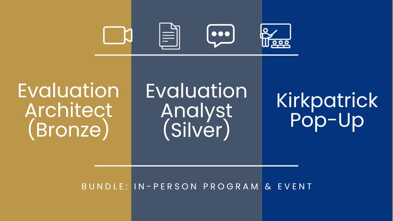 This in-person bundle combines the Evaluation Architect (Bronze) and Evaluation Analyst (Silver) certification experience with a Kirkpatrick Pop-Up, creating a powerful opportunity to move from learning to application. Building on the asynchronous content in the Collective courses, participants engage in an immersive, two-day, in-person experience where they actively apply the Kirkpatrick Four Levels, work through real initiatives, build a Blended Evaluation Plan, and begin crafting a Report Planning Form. Through hands-on activities, guided practice, and real-world case examples, participants leave with greater confidence in their evaluation approach and the ability to demonstrate meaningful value to stakeholders.